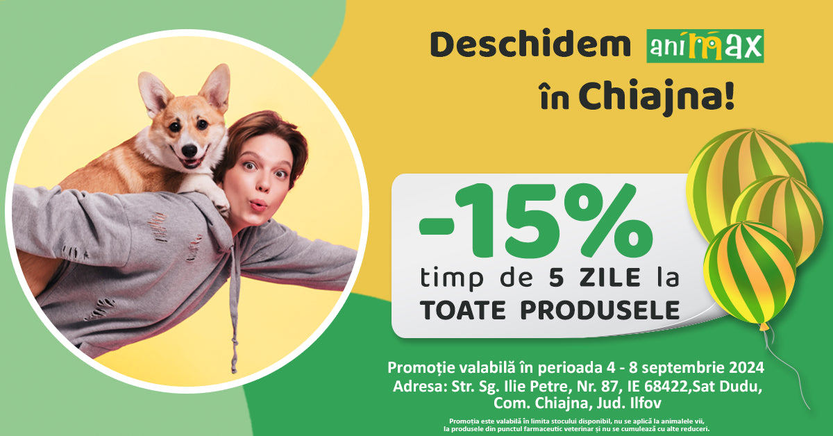 In 4 septembrie deschidem un nou magazin Animax in Chiajna Shopping Center!Si pentru ca vrem sa sarbatorim alaturi de tine, am pregatit o promotie inaugurala. Te asteptam in perioada 4-8 septembrie cu 15% 𝐑𝐄𝐃𝐔𝐂𝐄𝐑𝐄 𝐥𝐚 𝐭𝐨𝐚𝐭𝐞 𝐩𝐫𝐨𝐝𝐮𝐬𝐞𝐥𝐞 pentru animalute iubite*.