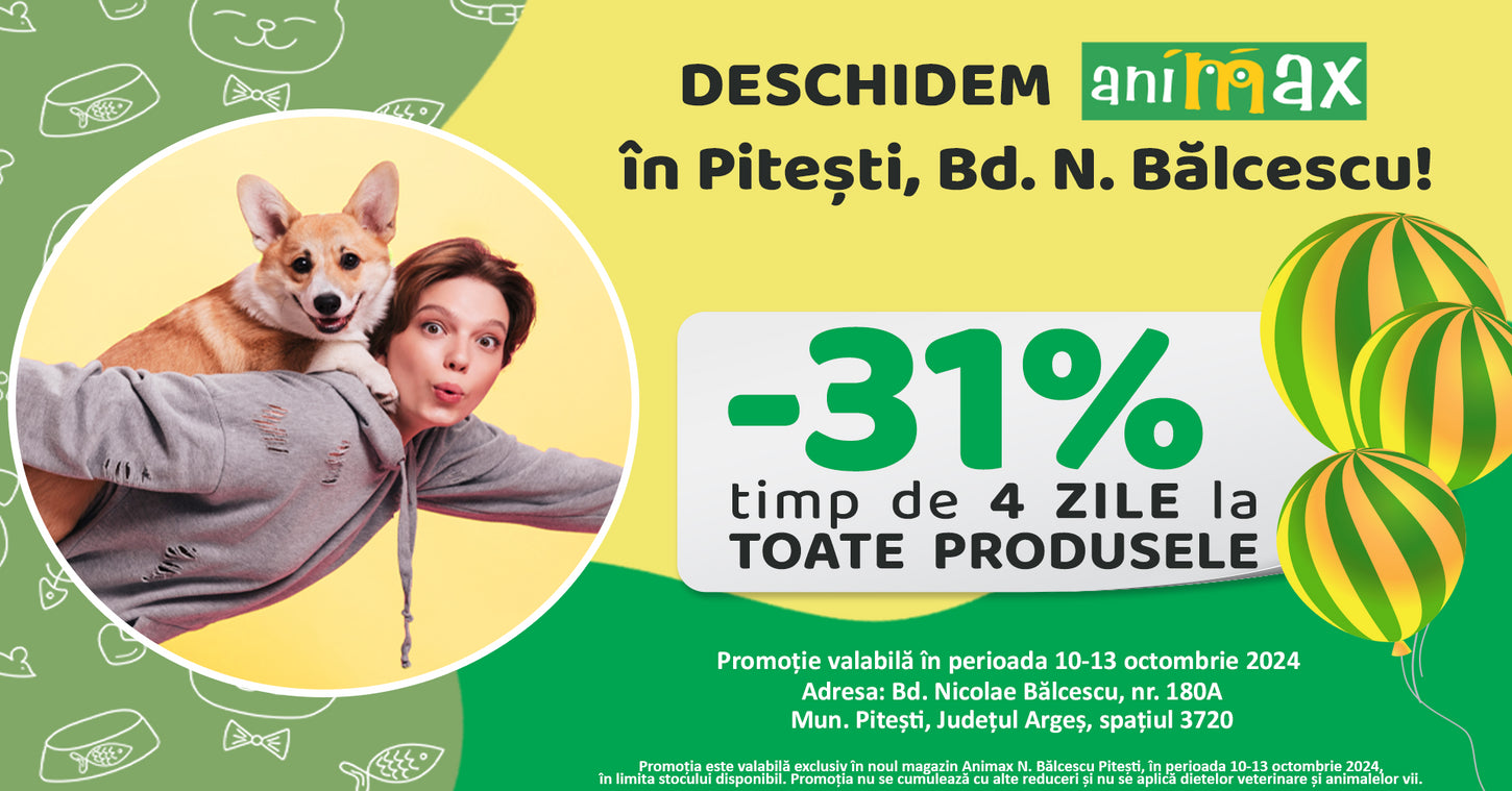 În 10 octombrie deschidem un nou magazin Animax în Kaufland Nicolae Bălcescu Pitești!Și pentru că vrem să sărbătorim alături de tine, am pregătit o promoție inaugurală. Te așteptăm în perioada 10-13 octombrie cu 31% 𝐑𝐄𝐃𝐔𝐂𝐄𝐑𝐄 𝐥𝐚 𝐭𝐨𝐚𝐭𝐞 𝐩𝐫𝐨𝐝𝐮𝐬𝐞𝐥𝐞 cu preț întreg pentru animăluțe iubite*.