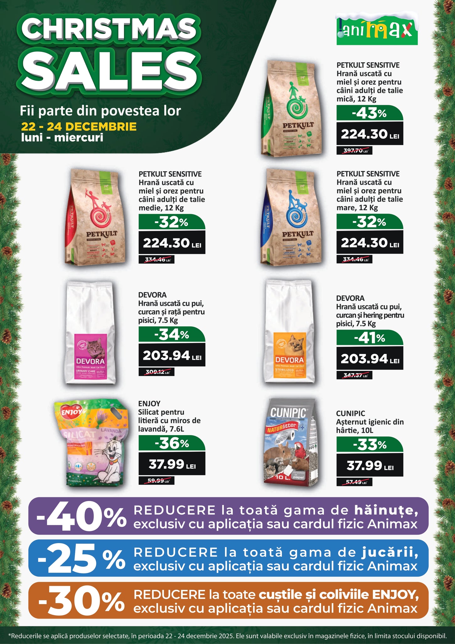 Reducerile sunt valabile EXCLUSIV în magazinele fizice ANIMAX, în perioada 22 și 24 decembrie, în limita stocului disponibil.