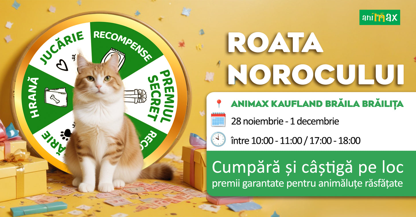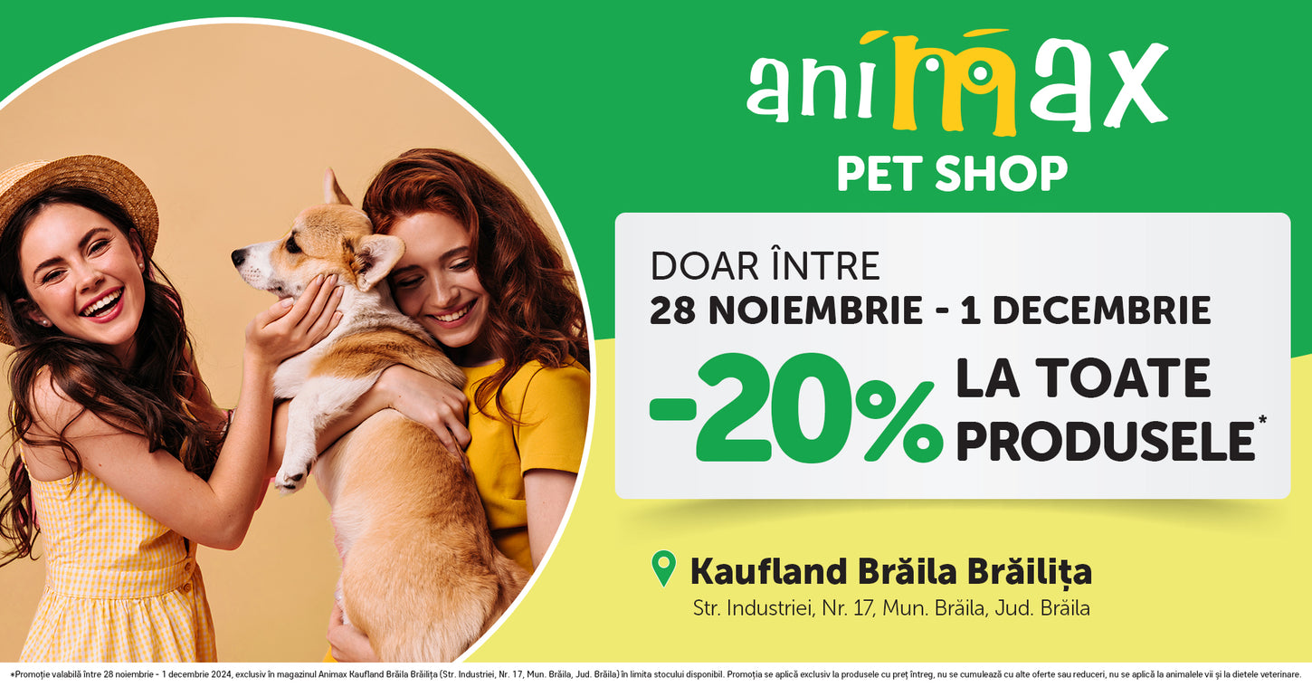 În 28 noiembrie, Brăila se pregătește să te întâmpine cu un nou magazin Animax, în Kaufland Brăila Brăilița! 🎉🥂✨Iar cu ocazia deschiderii, avem o surpriză pentru tine: în 28 noiembrie - 1 decembrie 2024, recompensăm iubitorii de animăluțe cu 𝟐𝟎% 𝐑𝐄𝐃𝐔𝐂𝐄𝐑𝐄 𝐥𝐚 𝐭𝐨𝐚𝐭𝐞 𝐩𝐫𝐨𝐝𝐮𝐬𝐞𝐥𝐞*.