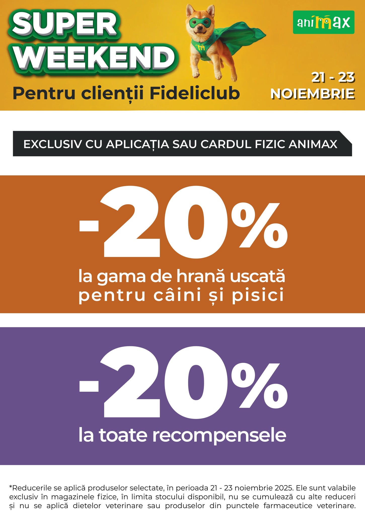 Aplicația și cardul fizic ANIMAX îți aduc super promoții! Între 21 și 23 noiembrie (vineri-duminică) vino în magazinele fizice și bucură-te de SUPER WEEKEND cu prețuri de nerefuzat pentru animăluțele tale!